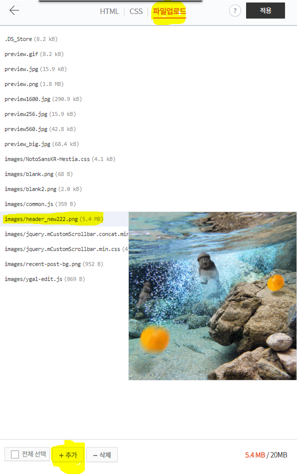위 순서로 접근 하신 후 '파일업로드 > + 추가' 버튼을 눌러 원하는 배경화면을 추가해줍니다.