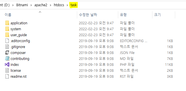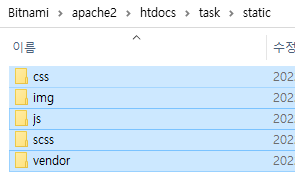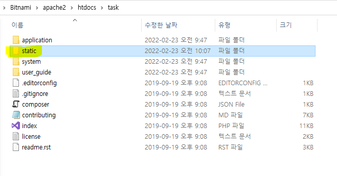 이 전에 Ci3로 생성한 task라는 웹 서버 경로(Bitnami\apache2\htdocs)에 static 폴더를 생성 한 후,