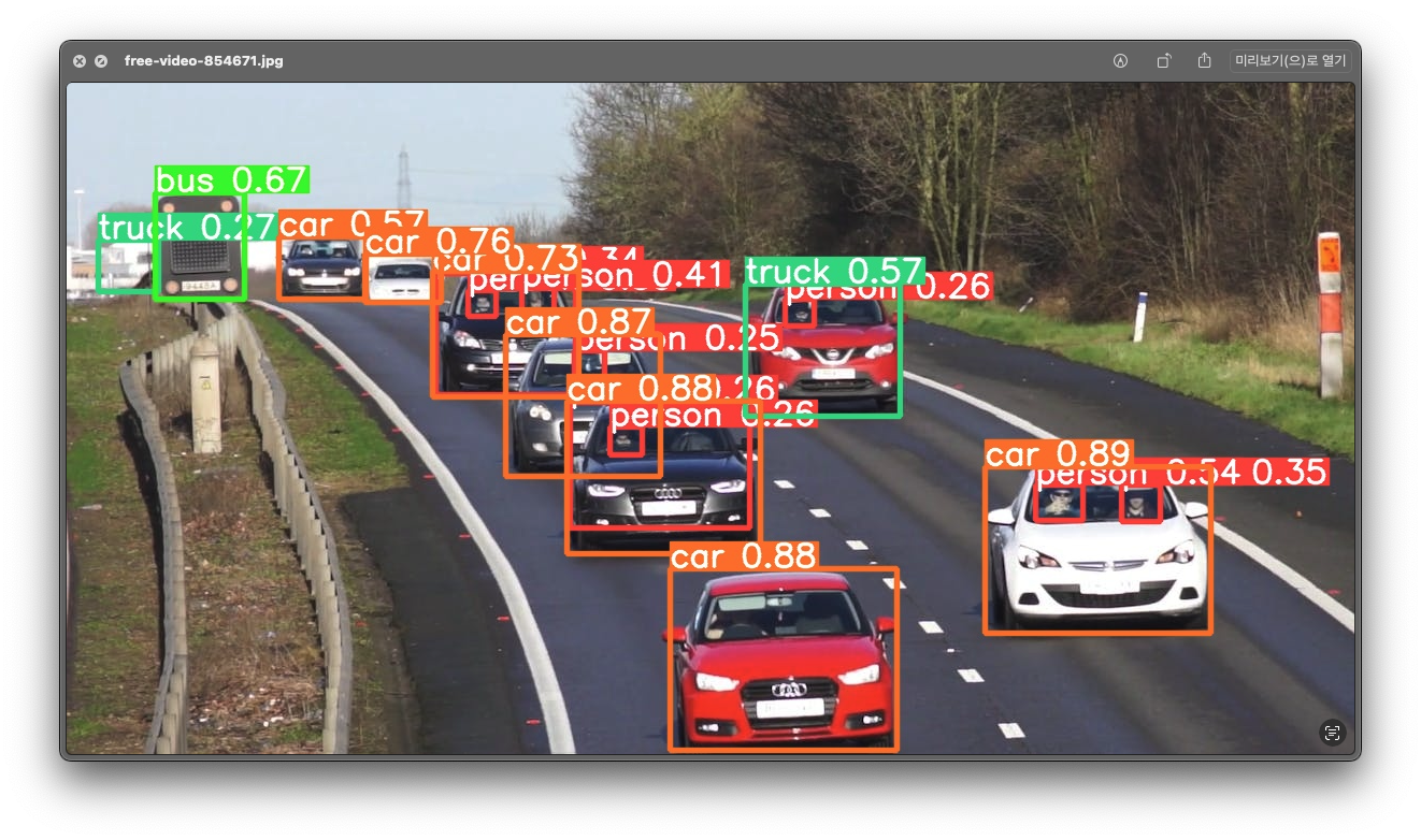 truck, bus같은 경우 인식 오류가 발생한듯 싶으나 대체로 잘 인식한 걸 확인할 수 있습니다.